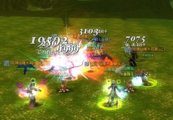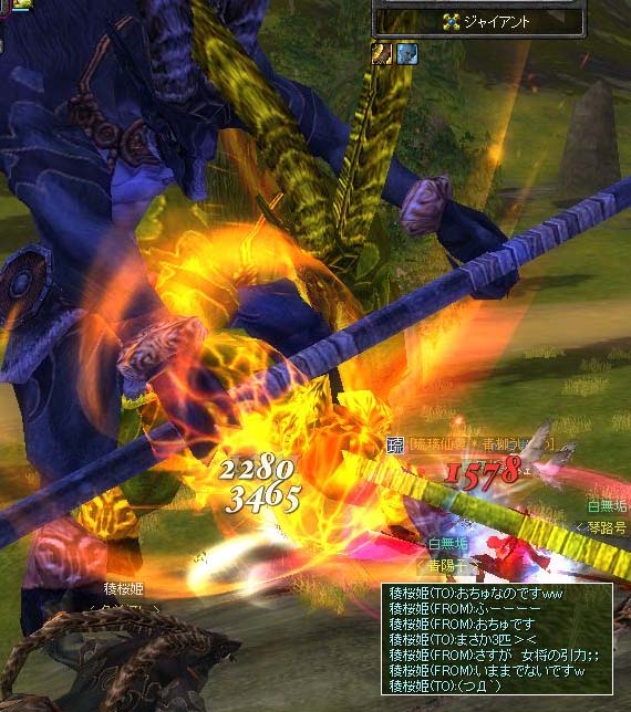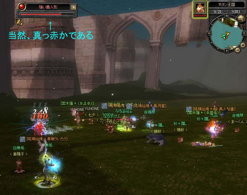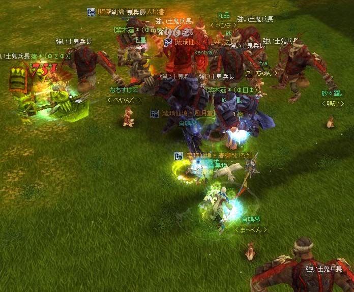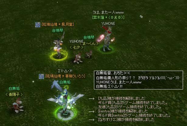 そして夜は、兼ねてから溜め込んでいた召還の巻物・パンドラの箱で、 2次会は紫木蓮さんと合流。 死亡者が出て復活させれなかったので (←スキル上げ、おろそかにしてます><) 盛り上がって3次会突入! 巻物2枚、同時召還。多すぎます… (>_<) 邪魔にならない場所として、和田の湖底を選んだのですが お隣さんの召還物が乱入してきました… 強ぇぇ~っ!固ぇぇ~っ! ウチの大黒柱であるケンさんが、軽く一撃で撃沈してました。 (つД`) 次々とメンバーが落ちていきました。 (>_<) 最後に1枚巻物を召還して、本日の宴会はおしまい。