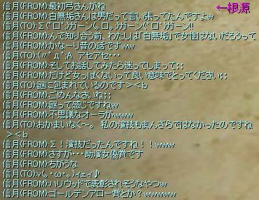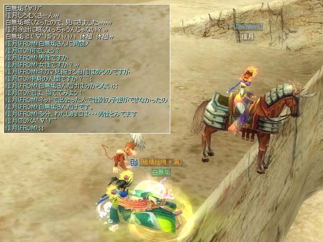 しばらくして私も狩りに疲れたので、休憩ついでに闘技場へ。 待ちぼうけしている間、質問されました… 信月さん、ネカマを見破れる眼力の持ち主らしいのですが、 私の性別は見抜けなかったようです。 どうやら判別する決定打を迷わせた一言が、以前にあったようです。 そういえば、学生時代にも似たような事がありました。 クラスメートで他人の血液型を見抜ける人が居ましたわ。 (^^;) 大きな事故も病気もしたことがなかったので、 自分の血液型を知らずに育ってまして…。 友人が「あんたは絶対A型だっ!」と百発百中的に言い放つもんだから、 ちょうど学校に来ていた献血車で調べることに。 結果… 予想は大ハズレでO型でした。。 友人の黄金伝説の終止符を軽くうってしまいました。 ≧(´▽`)≦ 話は戻って。 信月さんが離席されたので、根源の人に軽く突っ込みを… この後、延々と弁明が続いたのは言うまでもない… (⌒▽⌒)アハハ! でも、お二方のヨミはあながち間違ってないかもしれません。 元々、「白無垢」というのは花嫁衣裳からとったのではなく 台湾の人形劇に出てくる木偶の名前からパクったものですから。 その木偶の性別は男です。 ついでなので軽くご紹介。 台湾の人形劇… 布袋戯(ぷーたいし)っていう民族芸能のです。 私が観ているのはその布袋戯の現代版とうい感じかなぁ。 参考… 公式サイト(台湾) http://www.pili.com.tw/ この人形劇、日本のとは違って、 飛ぶ、血は吐く、首はねる、爆発しまくり… 過激です。 (〃゜д゜;A アセアセ・・・ 参考… http://www.youtube.com/watch?v=2Iq4Dh-g_U8 ちなみに、吹き替えがないので字幕で空気を読むのですっ! (`・ω・´)ゞ んでもって… 私が名前をパクってきた木偶の「白無垢」とはこんなんです。 全身真っ白な人形です。 フルネームでの名前入力ができなかったので 「白無垢」だけをいただきました。 台湾に旅行した時に、本を買ってきたのですが… 訳すのに疲れました…。 同じ漢字大国なので、漢字の雰囲気で読むしかないです。 (〃゜д゜;A おまけですが… お猿の「青陽子」もサブキャラの「素還真」も、 全部この人形劇の木偶名です。 写真右:素還真 左:青陽子 「琉璃仙境」というのは「素還真」という人の居住名。 写真背景のこの場所の事です。 (岩しか見えんね…) …とまぁ、無駄なお話でしたww さ、頑張って狩りしよう。 |狩場| λ............トボトボ PR この記事にコメントする