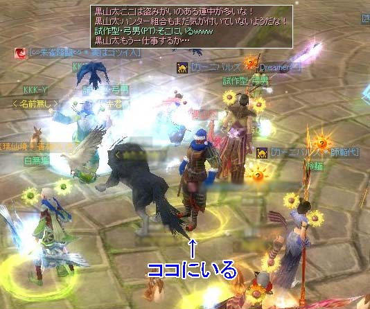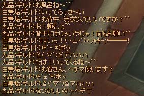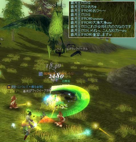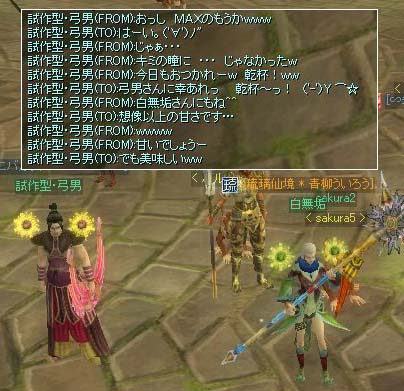 そして狩場にて黙々と狩りをしていると、お薬を持って蒼月くんがいらっしゃいました。 姫の時ほどいっぱい出なかったけど、まぁ懲りずにまた遊びにいらっしゃい。 (^^;) 皆さん、お疲れさまでした。 <おまけ> 琉璃仙境チャット、風呂落ち前の会話 PR この記事にコメントする